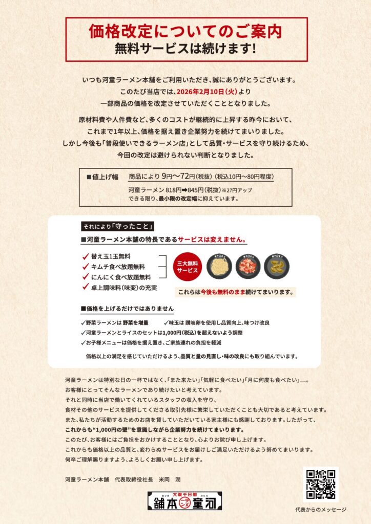 - 例)河童ラーメン:818円 → 845円(税抜) ※27円の改定